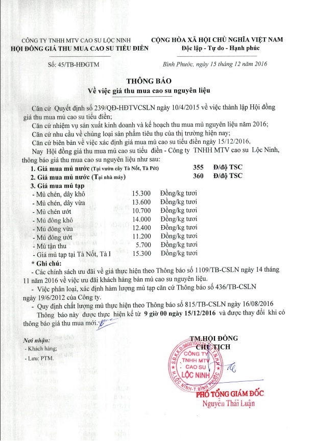 Ngày 15/12/2016, Hội đồng giá thu mua mủ cao su tiểu điền – Công ty TNHH MTV cao su Lộc Ninh, thông báo giá thu mua cao su nguyên liệu như sau:
